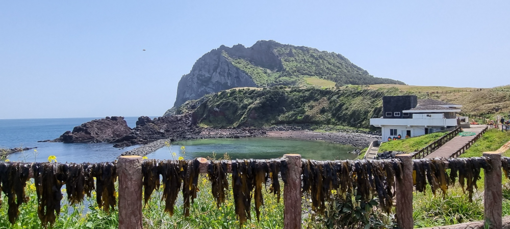 성산일출봉을 배경으로 한 이 풍경은 제주다움을 오롯이 담고 있어요.
